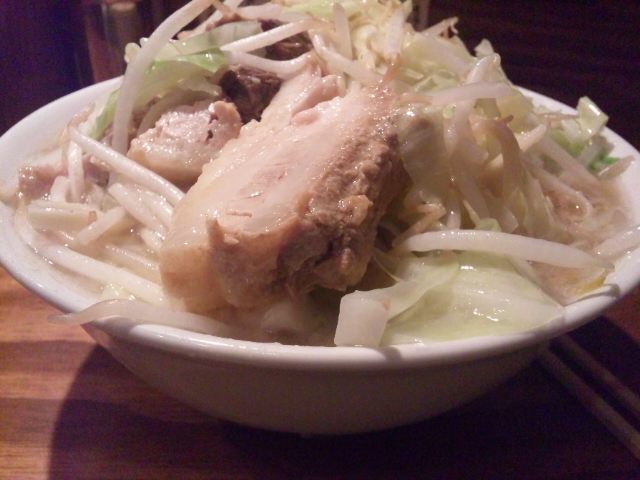 のスたOSAKA難波千日前店 特にリサーチをして行った訳でなく、 単に飛び込み。 お仲間は、なんば花月でお笑いを鑑賞も居りゃ~ 日本橋に萌えに行く者も・・・ 自転車仲間の若衆と二人で、大阪のサイクルショップ巡り。 その中での昼食であったので、まさに飛び込み。 丁度、正午過ぎであったが、すんなりと座れた。 行列が出来ていたのは、なんば花月付近のたこ焼き屋とうどん屋。 まぁ~うどんに関しては、大阪まで来てうどんは無いでしょ・・・四国人としては・・・ 一度はのスたをスルーしたが、何故か引かれる。 で、来店! 賄い醤油700円を若衆がオーダー 私は、賄い醤油の煮豚増し900円をオーダー 店主がワンハンドで淡々と麺を茹でる、 ラードガッツリのスープ鍋に背油チャッチャ儀式のようなことをして・・・ 更に大量のキャベツをザルを介して、スープ鍋に投入 タイミング遅らせて、もやしをそのザルに投入。 麺が茹で上がり、ワンハンドザルでどんぶりに分ける。 スープにくぐらせた野菜を盛り付けて出てきたのが、 コイツだ! 野菜が溢れんばかりに盛り上がっているが、 スープにくぐらせているので、 しっかり味が付いて美味い。 更にチャーシューが野菜の下から、ドカっと出てきた。 分厚い!なお且つトロトロ! 前日に飲み過ぎ食べ過ぎではあったが、 なんとも胃袋にどんッと来るボリューム。 しかし、美味いので汗をかき、拭きしながら、完食。 これはスゲェと店を出ると、行列が・・・ なんとも良いタイミングで、食べれたものだ。 のスたOSAKA難波千日前店 賄い醤油は、オススメです。 PR