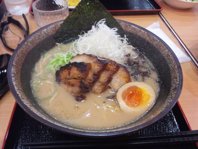 萬楽のラーメン 松山市内に3店舗あると言うことで どうなんでしょ? 2ちゃんねるでは、かなり酷いことを書かれてたりも気になるが… 百聞は一食にしかず… たまたま行ってみました。 土曜日の午後1時過ぎ 台風直前でもまぁ~まあいっぱいです。 オーダーは萬楽ラーメン どうやら醤油ベースではあるが、 最近よくある、白濁系のスープ。 でも、しっかり醤油スープ。 チャーシューが直前に表面焼かれて、香ばしくスープに伝わる。 うーん…麺は硬め。最近、硬めが流行り!? 針金とか行くときもありますが、醤油ベースのスープには… まぁ~好みがあるでしょう。 さて、お味は良い感じで旨い。 個人的には、麺柔らか目でオーダーしたい。 あと、チャーシューの4枚のせは、お得感があるが…ちょい、ムッこさが残るかな。 でも、スープは最後まで飲めるほどの出来!! お客の入りも納得!! 萬楽ラーメン700円、チャーシュー4枚のせ、白髪ネギ、味玉標準装備。 ノーマルのラーメンが500円。このノーマルでもチャーシュー2枚のせ味玉も入ってる。 ワンコインで頂ける、ノーマルのラーメンでも満足いくと思います。 |