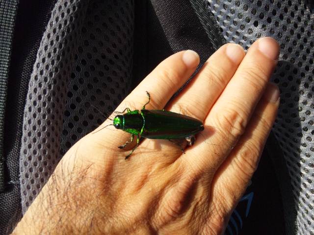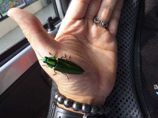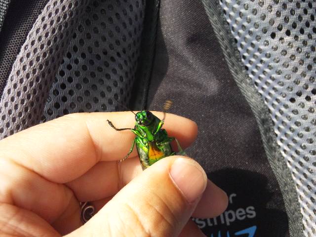 日中は、外に出るもんではないですなぁ~ まぁ自然は、普通に過ごされてますから、我々も普通に過ごさなくては… ( ̄∇ ̄;)ゞ 出来るかぃっ!! このクソ暑いのに、普通にせぇ!? おーっ!コラッ! Σ( ̄皿 ̄;; いやいや…怒ったところで、汗しか出ませんよ… クールにクールに… さて、前置き長すぎ 事務所のスタッフさんと車ででたところで 細長いカナブンらしき、昆虫が暑そうに飛んでいるではないですか… もしや…こいつは…と思っていたら、上司さんが「玉虫や~」 それも見事に車のフロントガラスに着地。 「上司さん~ゲット~ゲットぉ!!」とおねだり。 上司さん、見事に玉虫をゲット!! 早速、車中で玉虫の撮影会。 盛り上がってるのは、上司さんと私だけ… 後の若衆二人は興味なし。 そーでしょ♪ 撮影終わり、リリース。 暑いから満足に飛べなかったか!? もしかして…寿命…? 寿命なら可哀想… しかし、玉虫くん!!遺影は立派なのを撮ったでぇ。 なんちゅう縁起悪い粉とを… お盆近いぞ~ |