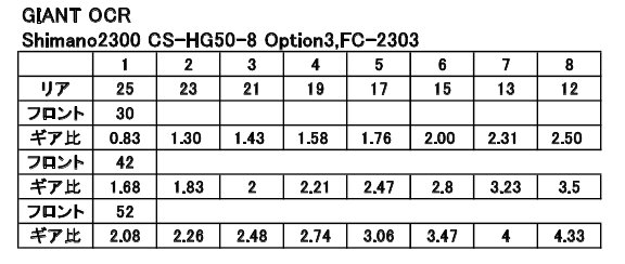 ショップへのストーカー行為が頻繁になってる 今日この頃。 後輩のdK氏より助言をいただき、 松山のスポーツデポにそこそこの品揃えと聞き、 行ってみました。 店内は、自転車のみならずスポーツ用品全般。 自転車部門は、 クロスバイクとマウンテンバイクが多く、 ロードバイクは、ちょい少なめ。 まぁど初心者なので、 ここは店員さんにいろいろと質問 現在の乗っているMTBの事やら 左膝が悪いのでギア費の事やら などなどを説明すると 親身になって、バイクの選び方を 伝授してくれました。 なかなか、イヤイヤかなりの好印象であります。 ロードバイクは、MTBに比べて ギア比が重たいと聞いていたので、 実際諦めていたけど、 店員さんの分かりやすい説明で 前向きに検討。 さて、家に帰り 愛車のMTBのギア比をチェック。 上図の様になり、 一番軽いギア比で1.07。 1回ペダルを回すとタイヤが1.07回転。 購入するのであれば、 愛車のMTBと同等のギア比であればOK! 更に8円未満で・・・ との条件で スポデポの店員さんに探してもらった。 いやいや相談はしてみるもの、 案外と簡単に見つけてくれました。 そのマシンが、こちら! GIANT OCRでございます。 店員さんが申されるに 初心者向きで ポジションも楽であると。 金額も7万円を切るし、 ギアのシステムshimano2300を フロントのクランクセットをFC-2303に交換。 これでフロントのギアが3枚となり ギア比も愛車のMTBに近づくとの事。 車重もMTBに比べ、6kgも減。 それだけで、かなり楽に走行が可能との事。 スポデポの店員さんK氏のテクに 完全に悩殺され、 いざ発注と相成りました。 現在、組み立て、調整中。 この3連休もお店に行きますと、 ボディは組まれており、 最後のパーツを待つのみとの事。 いやいや、 完全に自転車熱が 下がりません。 困ったものだ・・・