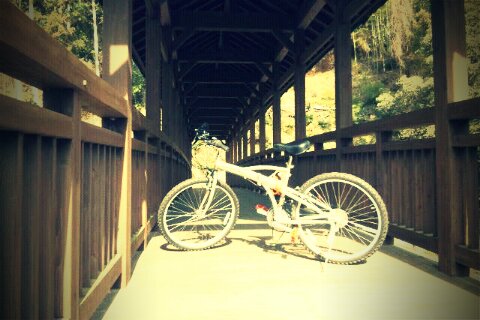 マウンテンバイクで行ってみました。 往復で約60km。 3連休の初日。日地曜日と月曜日は、 どうやら天気が悪いようで、 今日しかねぇ!などと思い いざ出発。 自宅の山道を下って 県道310号へと、 310号をさらに下って 県道29号に合流し、五十崎→内子と走り、 国道56号に出る。 ここからクラフトの里まで一直線。 途中、1時間走ったところで小休止。 立川の屋根付き橋 ここで地元の方に遭遇。 気持ちよく挨拶をした。 この屋根付き橋付近が 内子町と伊予市の境目である。 道中、リアカーで四国1周にチャレンジの オッちゃんに遭遇。 オッちゃんとも気持ちよく挨拶。 ここから約30分で 「クラフトの里」に到着。 自宅から1時間30分。 喫茶から美味しそうな コーヒーとパンの香りが バンバンしてくる。 一服したいが、 ここから自宅までとんぼ返りなので 今回は遠慮しよう。 一路、自宅に向けて走り出す。 ここで発見! クラフトの里から内子町に向けては、 下りが多いんだと。 30分かからず 「内子フレッシュパークからり」に到着。 ここで約2時間の走行なので、 水分補給がしたい。 しかし・・・ 「からり」って自販機ないの? 3連休の初日で大賑わい。 かなりの人が直売所に。 自販機探しをさっさとあきらめて、 いざ出発。 とその時、MTBの後方に停めてある スーパーカブのおばちゃんに話しかけられる。 楽しく談笑を交わし、カブのおばちゃんを見送る。 このカブのおばちゃんのお年は80歳らしい。 でも元気にカブで去っていった。若い! 何か自転車ツーリングって楽しいな。 などと感じている。 ハーレーとは全く違う感覚。 こう言う会話は、何よりの栄養補給になる。 が、のどが渇いた。 近くのサンクスでポカリを補給。 美味すぎる、ポカリ。 ここから県道29号に入って 県道310号→自宅へと永遠に続く ヒルクライム。 さすがに疲れた。 しかし気持ちよかった。 気になるのは、 折り畳みのMTBなので 走行中にキシキシと音がする。 ペダルを漕ぐ力が、 そのまま推進力として伝わってないような気が・・・ またもやロードバイク購入計画かぁ~ ふふふっ! すでに進んでおりますわぃ! いきなりの写真! 何ですかっ?これは・・・ と、お思いの方多数。 今乗ってるマウンテンバイクのメーカー名。 どこそれ? 私も知らん。 ただジャスコで 折り畳みのマウンテンバイクが29800円だったので 食いついた。それだけ~ まぁ気に入っております。 松山に行きますと 颯爽と格好のエエMTBの御仁がおりますが、 それはそれで。人は人。 折り畳みなもので 便利。超がつくほど便利。 しかし、最近。 長距離を走りたくて・・・ 先週末も気持ちよさそに ロードバイク?ロードレーサーが走っております。 ポンコツの左膝に ドンジョイの装具付きでの走行なので、 まぁ~マイペースで 「勝手に抜け!」などと思うだけですが、 実際、あのロードバイクの軽やかな走りは、 MTBには無い・・・ あの細っいタイヤは、 さぞ設置面積が少なく、MTBよりか 抵抗を感じずに走るんやろなぁ~ などと まぁ物欲が沸いております。