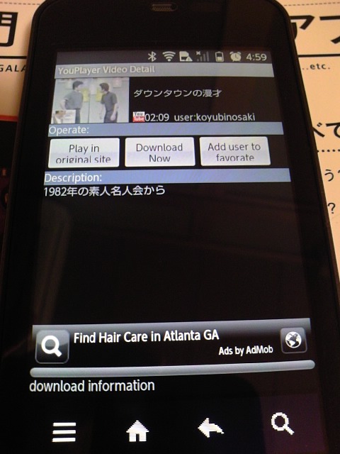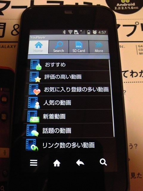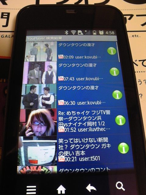 サクっと ダウンロードが出来るアプリ。 「You Player」であります。 無料と言うことで 何気にインストール。 使い方は、簡単。 ホームの画面で 「おすすめ」やら「新着動画」を 選ぶのもよし! また、「Search」を使って 検索も可能。 「ダウンタウン」で検索すると いろいろ動画が 出てきました。 当然、再生も可能。 右端のグリーンの アイコンにタッチすると こんな画面になり 真ん中の 「Download Now」をタッチで 動画のダウンロードが可能。 ダウンロードされた動画は、 ホーム画面の 右上の 「More」をタッチ 「YouPlayerFolder」の中に 収められている。 これは、普通に使えます! ただ、残念なことがある。 動画の中には、 「mov形式」のファイルが多々あり、 この形式の動画ファイルは、 ダウンロードが出来ても、 再生は出来ない。 ただ、その場で見ることは出来る。 パソコン上で 再生可能なファイルに 変換は出来るが、 そこまでして見るのであれば、 その場で楽しんで見るしかないのでは・・・ PR