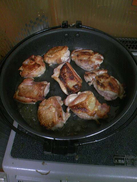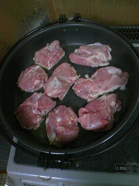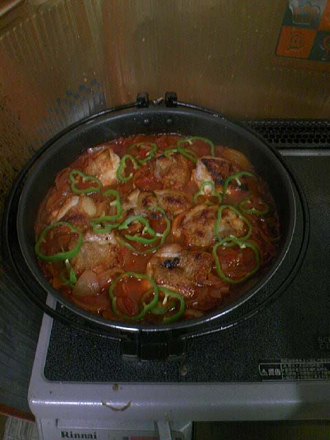 チキンのトマト煮込み 早速、材料(4人分)鳥もも肉 約600g、タマネギ 2個、ピーマン 1個ホールトマト缶 1缶、ニンニク 2かけら、エクストラバージンオリーブオイル 小さじ1、酒 大さじ2杯 作り方 ニンニクを縦にカットし、芽を取り除き、スライス(縦にカットせずにまんまを包丁等の平らな部分で押付けると尻の部分から芽がにゅぅっと出て来るので、竹串などを使って取除くとスライスした時にワッカ状のプロっぽいニンニクスライスが出来る。…が、面倒である) 鳥もも肉を大きめにカットして、塩こしょうをしっかりする(これ大事) タマネギはスライス(1cm以内に) ピーマンは輪切りスライス(5mm程度に) 下ごしらえは、こんなもの テフロンのフライパンにEXバージンをたらし、ニンニクを入れて火をつける(中火) ニンニクの良い香りがしたら、取り出す。焦がさない様に! 鳥もも肉を皮を下にして焼く 皮が良い焼き色になり、パリッとするまで焼く ここで酒を入れ、肉を裏返して、弱火で約5分焼く 焼き上ったら器に取り出す。フライパンの中の油は捨てない。その中にタマネギを入れて中火で炒める。タマネギがシンナリとしてきたら、ホールトマトを入れる ホールトマトは炒めながら、ヘラで潰す 先ほど取り出したニンニクを入れて(お好みでローリエなんて入れるのもええですな)、全体がグツグツと言い出したら水を100ccを入れて更に煮込み、またグツグツと言い出したら弱火にして塩こしょうで味付けをし、フタをして10分程度煮込む。塩の加減はお好みであるが目安は小さじ1/2程度 次に取出した鳥もも肉をトマト煮込みに入れる。この時、皮の部分を上にする。ピーマンの輪切りスライスをちりばめて、弱火でフタをして更に10分煮込んで完成 我が家では、喰い盛りの兵士がいるので更に茹で上ったパスタをいれて絡めて食べる。 通常の調理法ではEXバージンを沢山使うが、ここではごく少量であるのがキモ! 肉を食べ終わってもトマト煮込みソースが残っていたら、別皿に取って翌日、電子レンジでチンして、温かい飯の上にかけても美味い PR