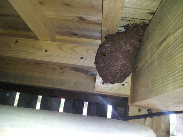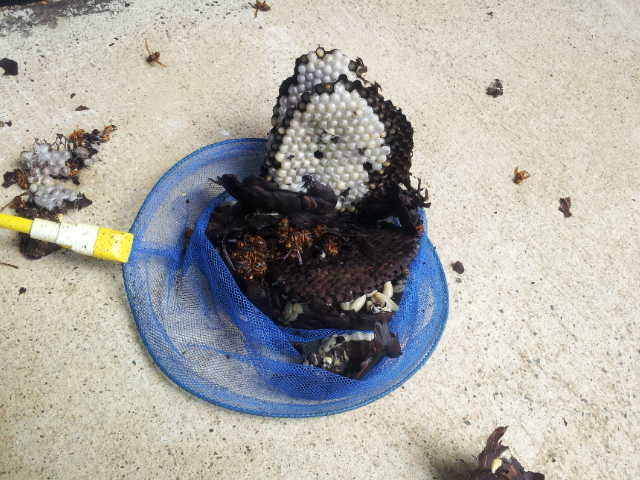 平々凡々の日々。 気温と世界情勢だけが熱くなっておりますが… そーんな平凡な日々、遂にバイオレンスな 事態が我が家に… ス ズメバチの襲来である。 最初は、「なーんか最近、デカい蜂をよく見ることねぇ?どっかに蜂の巣があるんじゃねぇ?」的な感じであったが、 ここ最近は、軒下から小ぶりのスズメバチが行き来している。 まさに古い映画であるが、TopGunのオープニングで ケニーロギンスのディンジャーゾーンが鳴り終わるときに、 F-14が空母に離着陸している様子。って、余裕をぶちかましてる場合ではない。 先週は、ハチ専用の殺虫スプレーを買って、 離着陸しているハチに噴きまくった。 ざっと30、40匹は、撃墜したかな。 しかし、巣を仕止めないと意味はない。 景気よく離着陸を繰り返している。 この時点で悟った。 時に第二次世界大戦で制空権を取るものこそ、勝者。 正にこの事である。 ハチ専用の殺虫スプレーマグナムジェットを一缶握りしめ、 巣の場所も分からないままの総攻撃は無謀。 玉砕は、してはならないのだと。 軍事ネタは、このくらいで… さて、勇気を出して、敵艦隊の様子をうかがうべく出撃。 軒下に侵入。 おー、何とバレーボールくらいのススメバチの巣を発見。 近づくと、巣から蜂の大群がうごめく、何とも言えない音が聞こえる。 敵本陣の情報もキャッチした。と言うことは、攻撃あるのみでしょ。 てな訳で、ホームセンターにて マグナムジェット3缶、麦藁帽子に装着する顔面防護ネット、厚手のゴム手袋を購入。 いざ出陣。 蜂採り名人は、夜襲をかけるらしいが・・・ 週末は、めちゃ忙しいので、早速決行。 巣に近づき、マグナムジェットを小まめに噴霧。 ここで発見。 蜂用の殺虫スプレーの威力の凄さは、噴霧量にある。 約1秒間、巣にめがけて噴霧すると 殺虫液がビチョビチョ滴り落ちるほどである。 恐るべし。こ んなものを顔面に気食らったら・・・ 噴霧のたびにスズメバチが巣から苦しみながら飛来。後に落下の繰り返し。 数匹こちらに向かって飛んできたが、装備もばっちりという余裕の心構えなので落ち着いてジェットで応戦。 巣の中では、もがき苦しむ蜂の異音が鳴り止まない。 マグナムジェットを1缶使ったところで、巣からの蜂に飛来、異音が無くなった。 念 には念を入れて、巣の上部と中部に穴を開けて、ジェット噴霧。 やはり、残党が出てきた。危ない危ない・・・ こ こまで使ったマグナムジェットは、1缶半。 ここで落城に踏み切る。 高枝切りハサミで蜂の巣の根元を切ろうとするが、何とも頑丈。 完璧な土台が作られており、ひとまず断念。 作戦を変更。 中断より上の部分をざっくりと落として、虫取り網でキャッチ。 かなりの重量である。その後、残りの巣を根元よりゆっくりと落として、見事捕獲成功。 グロテスクな蜂の子が、猛烈に居た。 捕獲成功の達成感の後の大量虐殺の罪悪感が止まない。 こちらも家の安全を考え一生懸命、ススメバチも命がけである。 上手く共存は、できないものかと・・・ PR